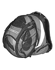 A sensibly proportioned backpack for motorcycle use Padded shoulder straps Adjustable waist belt for secure fit Main central compartment Two side pockets Features unique inbuilt helmet? cradle? enabling helmet to be stored.